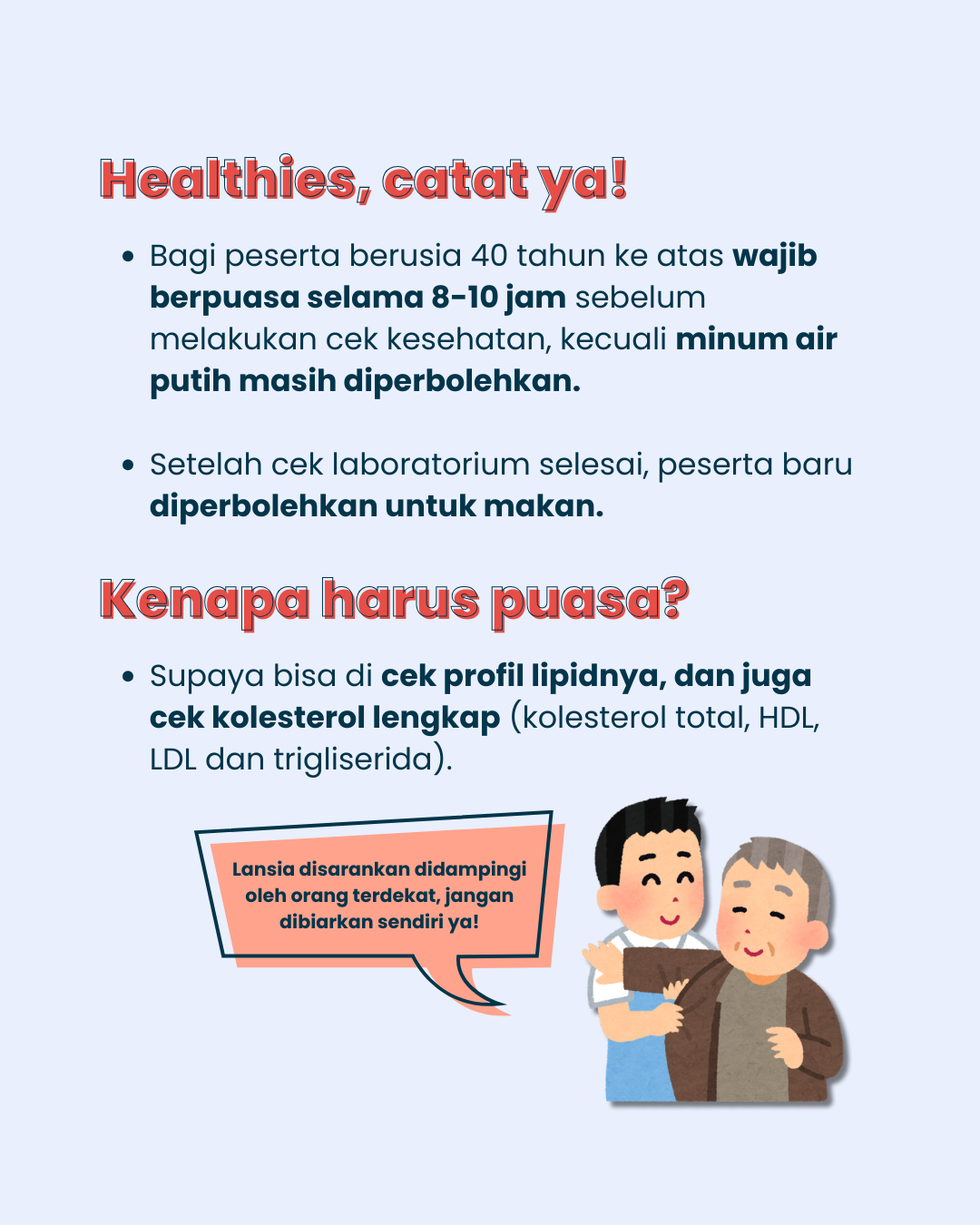 - Buat yang 40+ wajib puasa 8-10 jam sebelum cek (minum air putih masih boleh!).